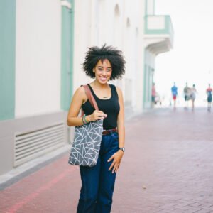 Our geo print tote is a sleek bag that can hold books, a laptop, or groceries! The straps are genuine leather.